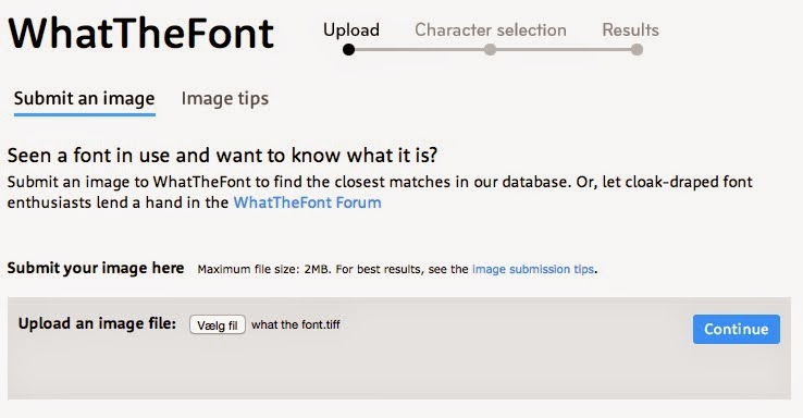 Upload et billede *.jpg af den font du gerne vil have navnet på. og den vil komme med forskellige forslag
